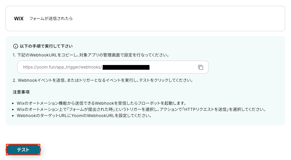 「テスト」をクリックして、Wixのトリガーイベント(フォームの送信)が正しく受信されるか確認しましょう。