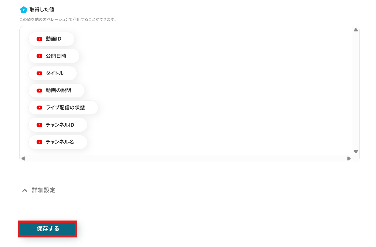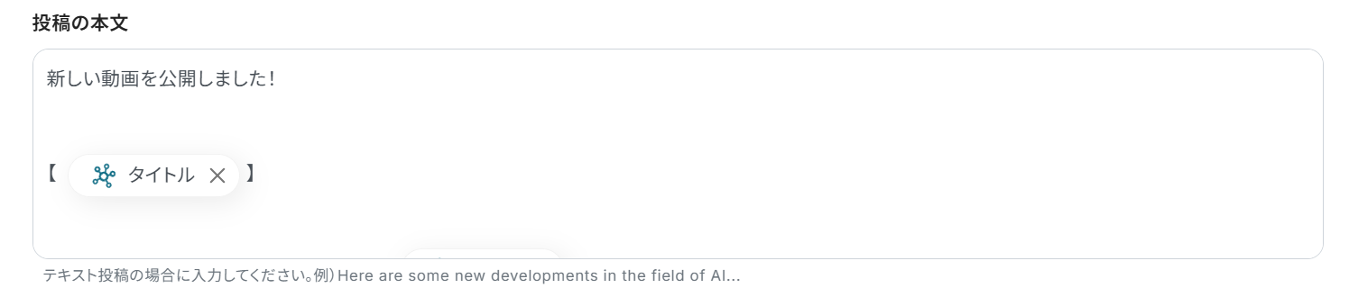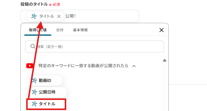 投稿のタイトル:入力欄をクリックすると、YouTubeの情報を引用することも可能です。なお、メッセージを全て手入力してしまうと、同じ内容が何度も投稿されてしまいます。繰り返しを防ぐために、「取得した値」をうまく活用してくださいね。