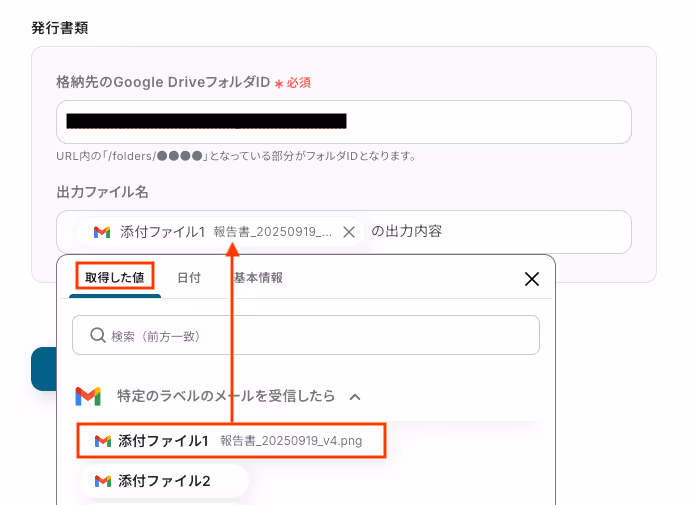「格納先のGoogle DriveフォルダID」を候補から選択し、「出力ファイル名」は取得した値から選択します。