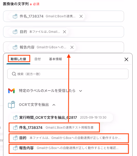 「置換後の文字列」を、取得した値からそれぞれ選択します。