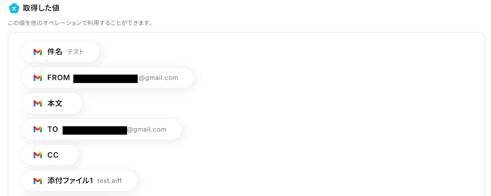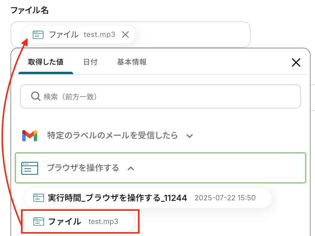 ファイルの添付方法:「取得した値を使用する」を選択