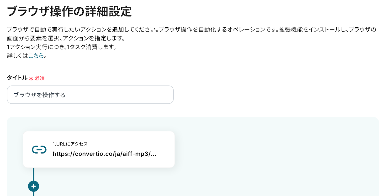 - 次に、オペレーションでRPA機能の「ブラウザを操作する」アクションを設定し、オンラインのファイル変換サービスなどでAIFFファイルをMP3に変換する操作を自動化します。