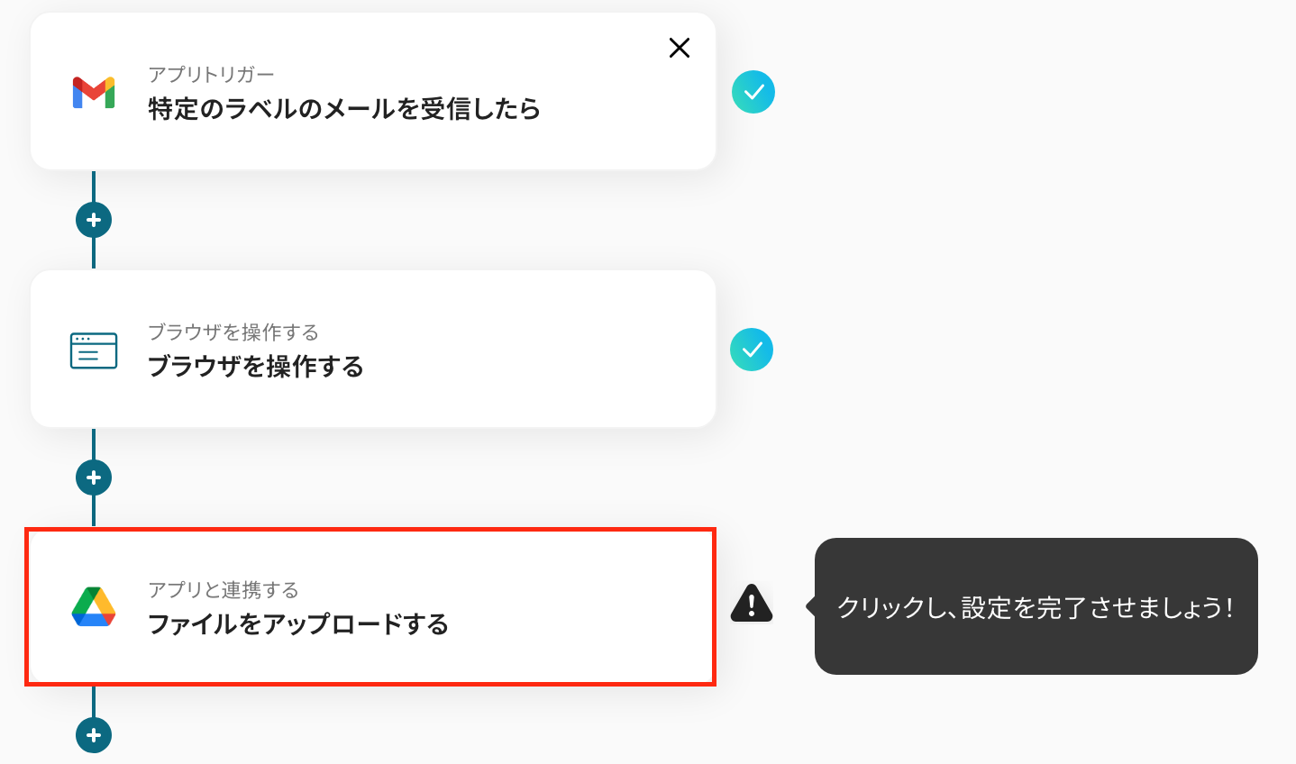 - Google Driveにファイルをアップロードするアクションでは、ファイルの保存先となるフォルダを任意で指定してください。