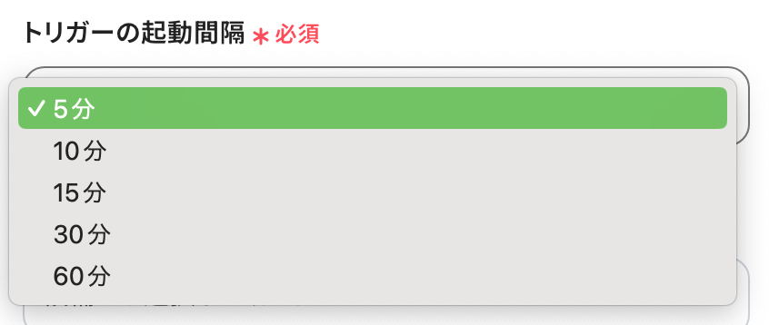 - トリガーは5分、10分、15分、30分、60分の間隔で起動間隔を選択できます。