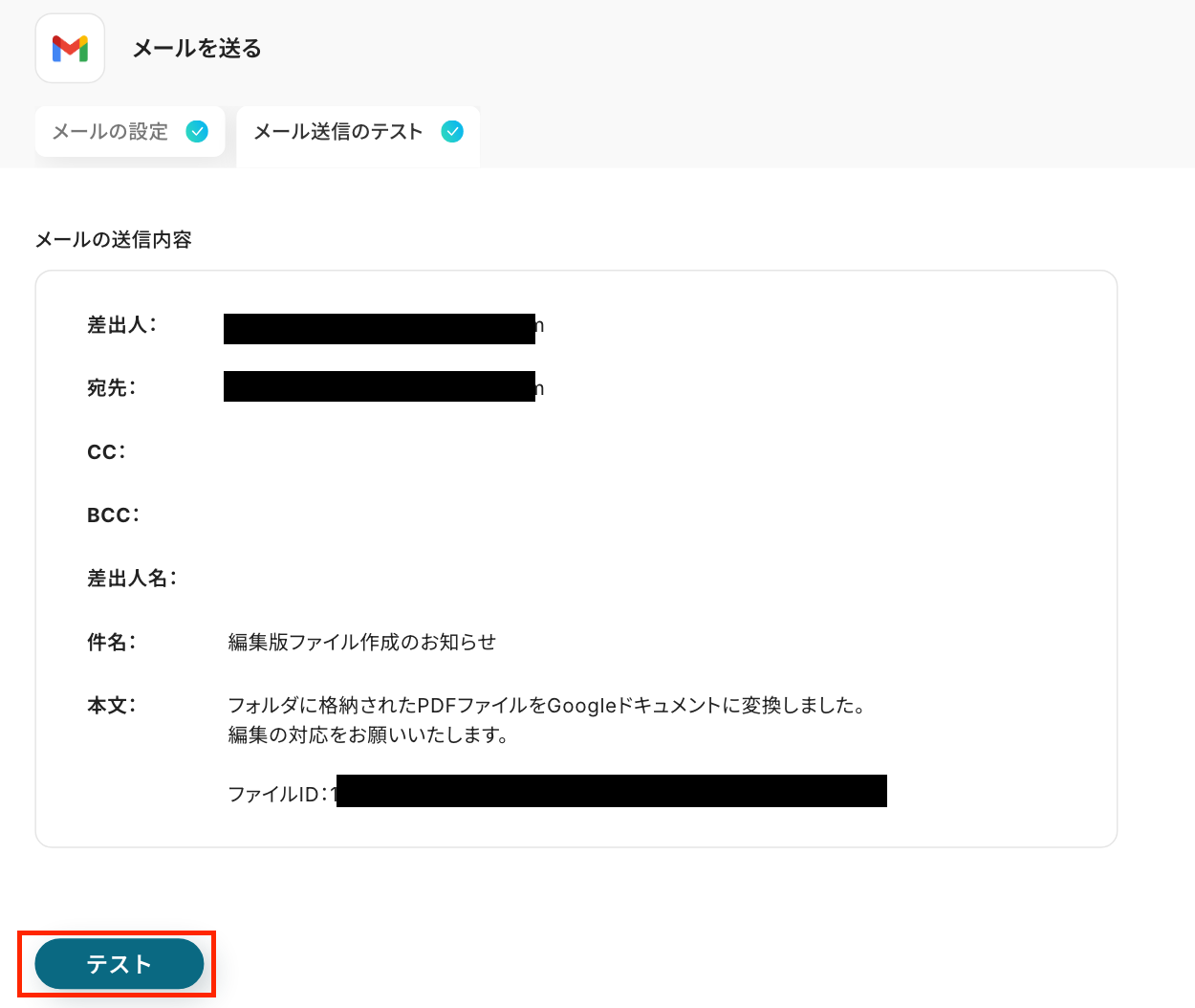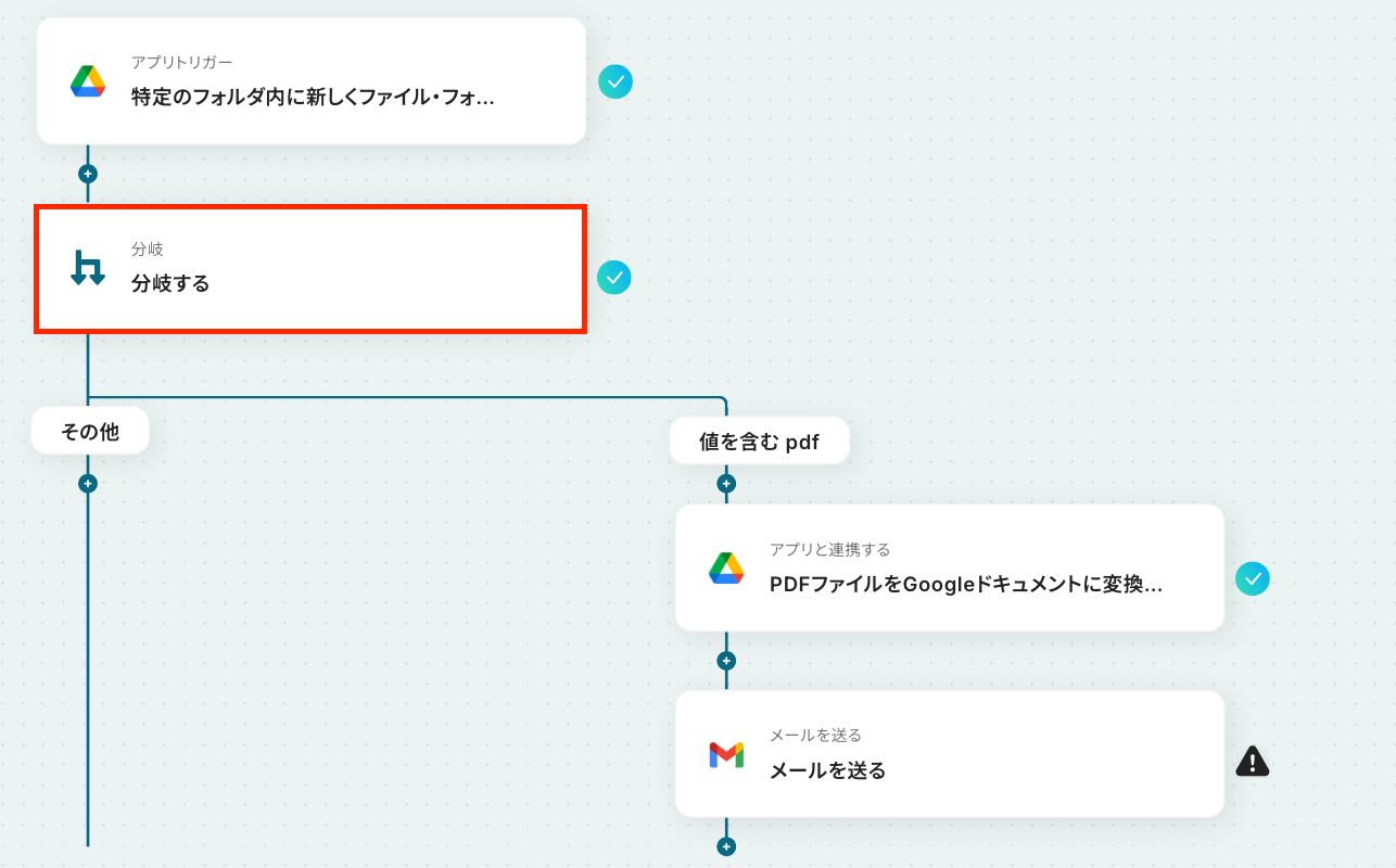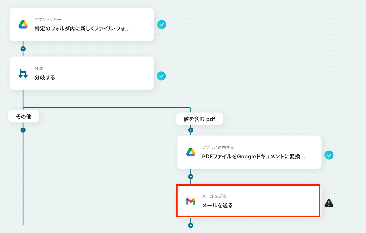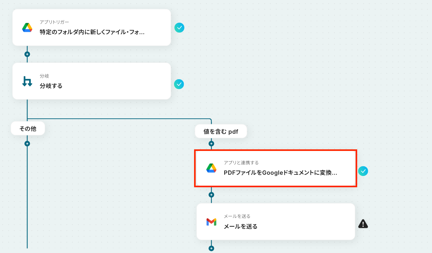 ここでは、PDFファイルをGoogleドキュメントに変換したことをGmailに通知する設定を行います。