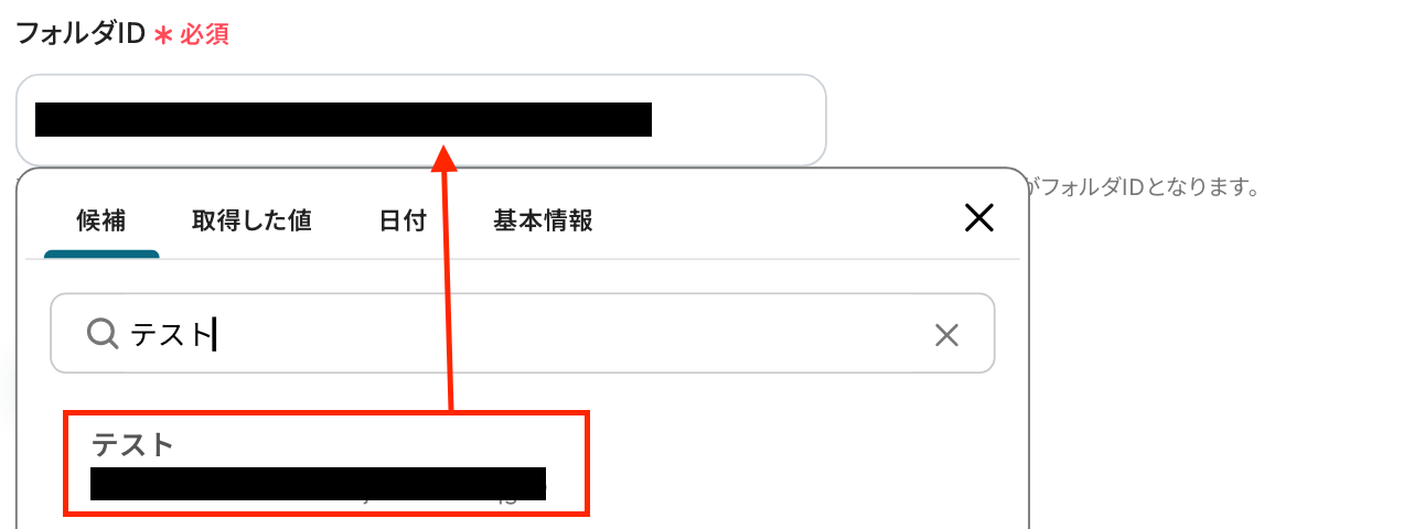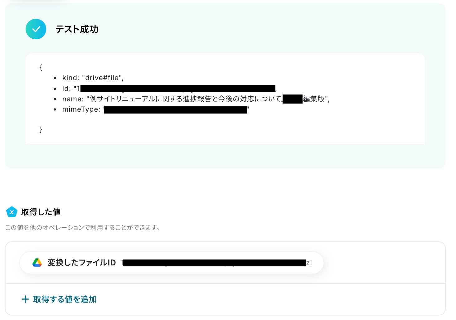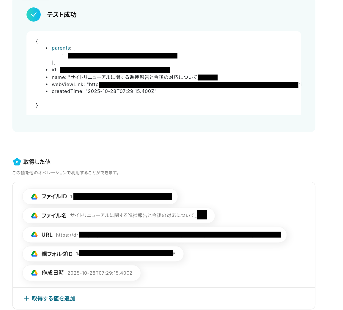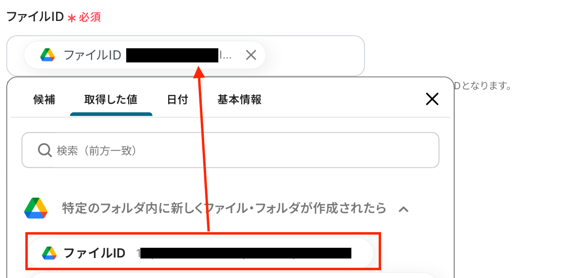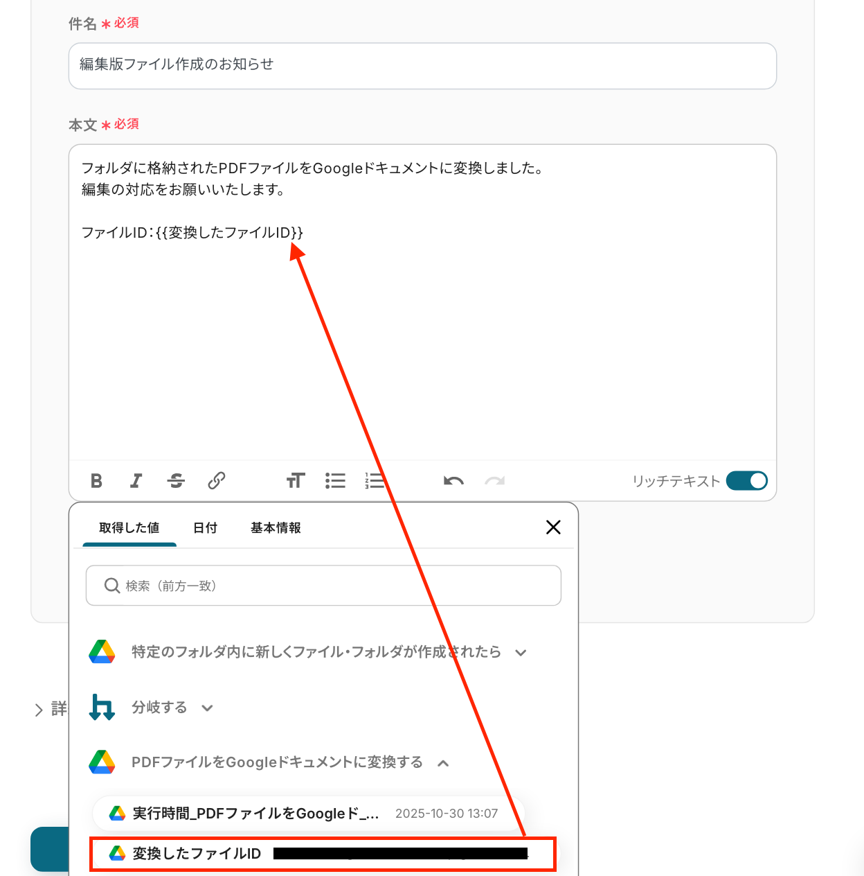 こちらもGoogle Driveのトリガー設定で取得した値を引用して設定しましょう。