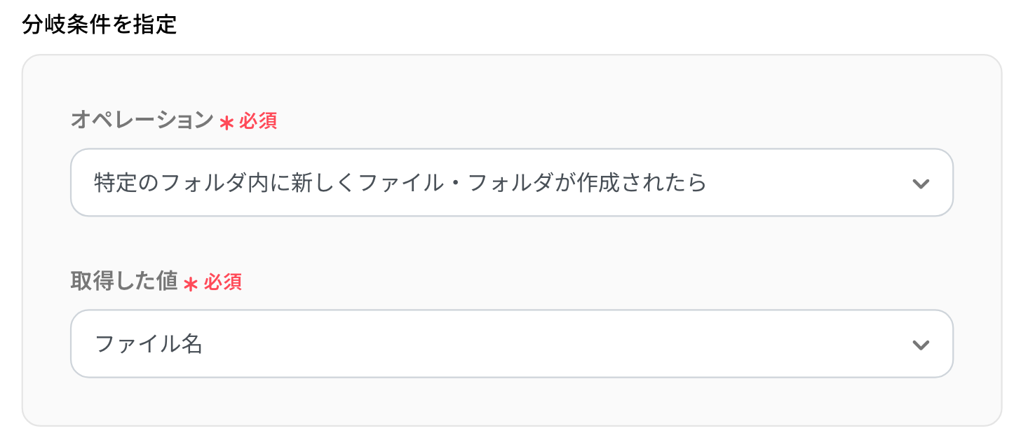「オペレーション」は、「特定のフォルダ内に新しくファイル・フォルダが作成されたら」を選択してください。
