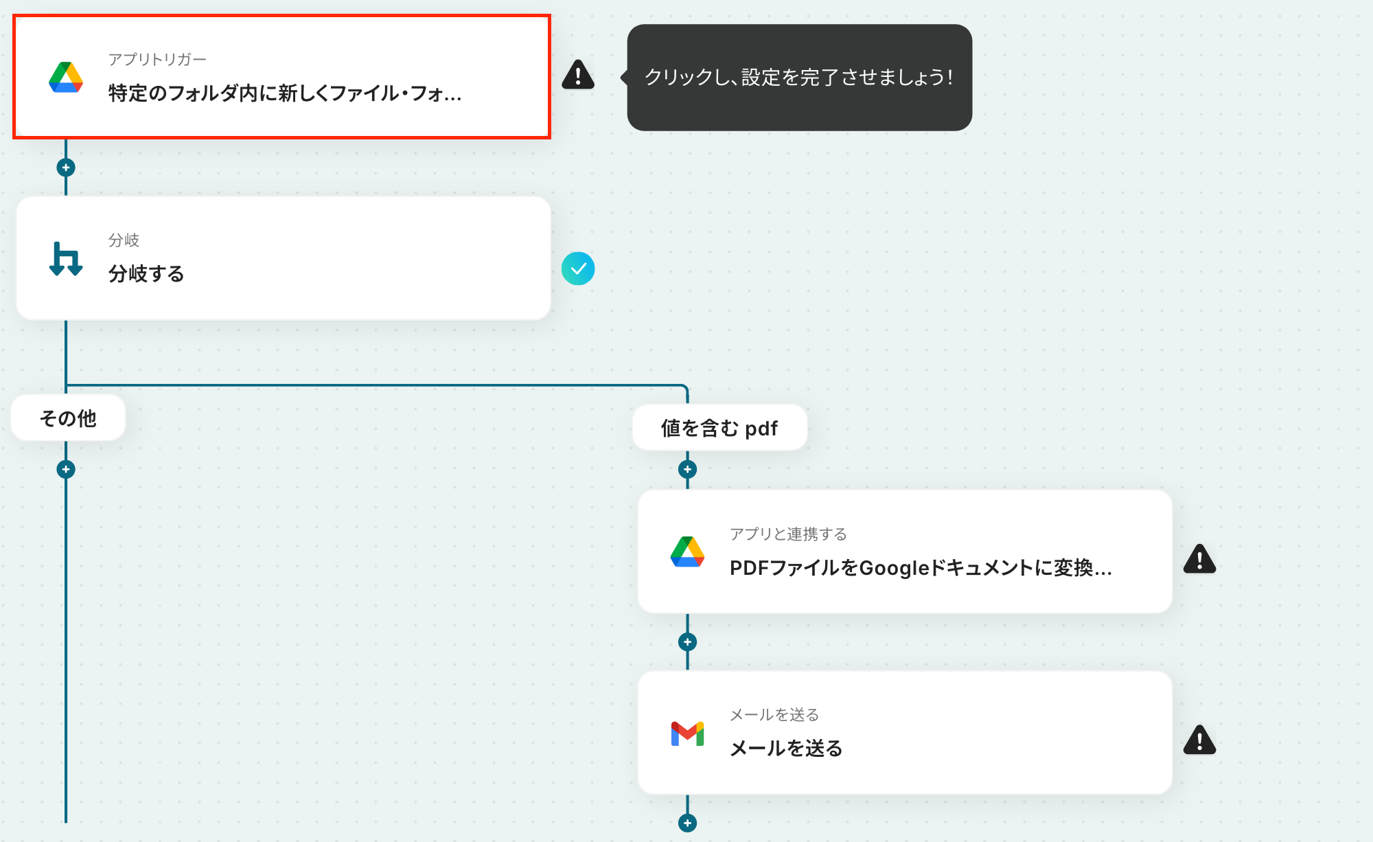 - Google Driveのトリガー設定・分岐の設定・Google Driveの設定・Gmailのアクション設定