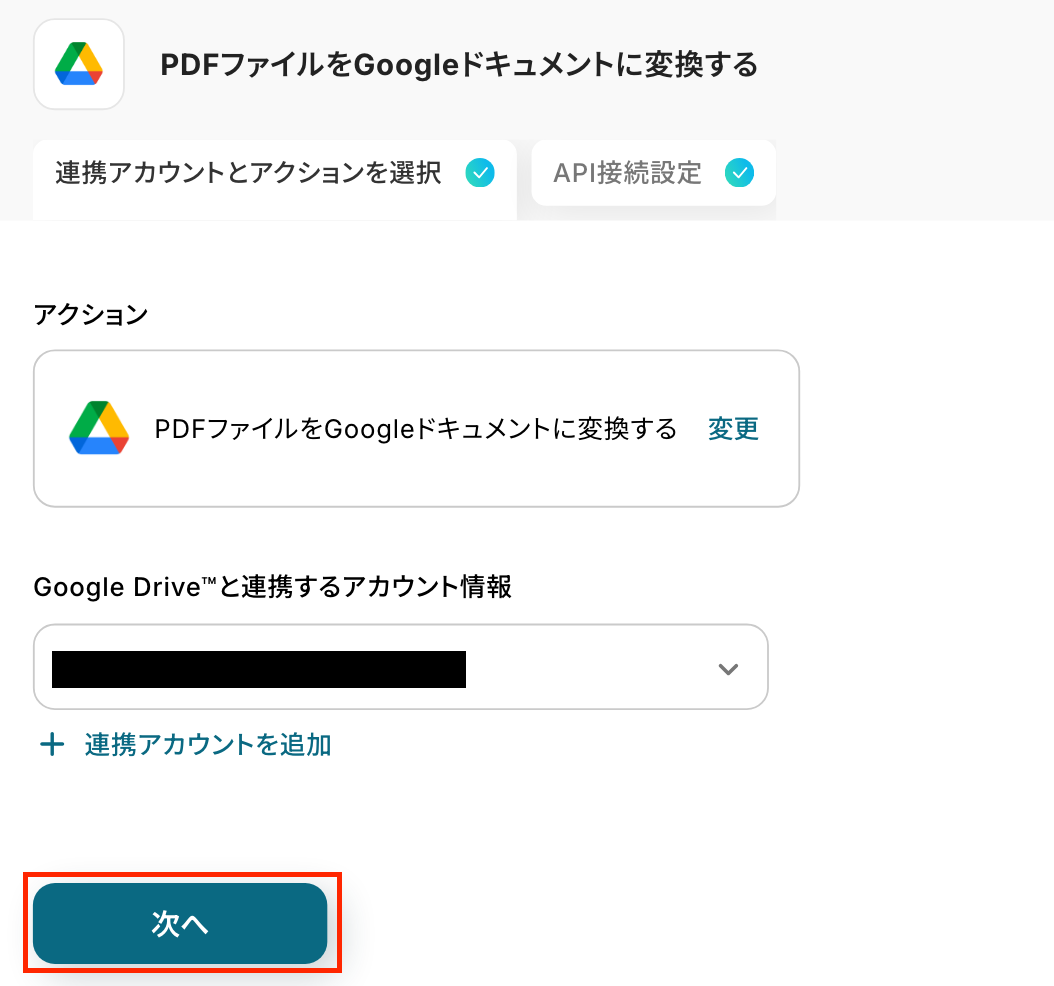 ここでは、PDFファイルをGoogle ドキュメントに変換する設定を行います。
