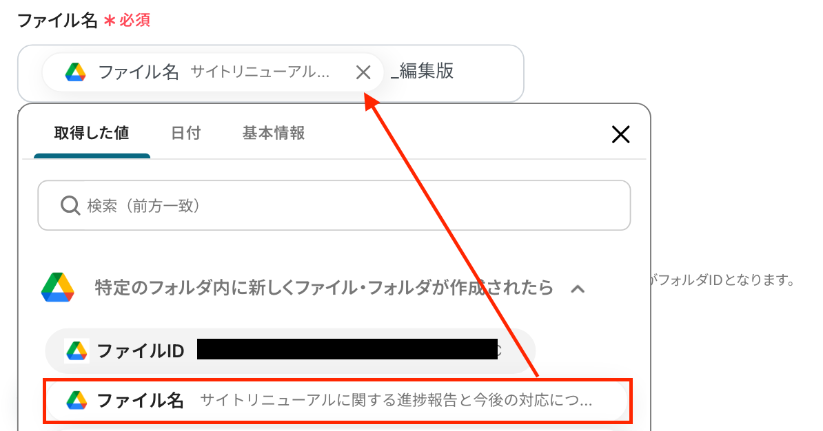 「取得した値」は、先ほどのステップで取得した「ファイル名」を設定しましょう!