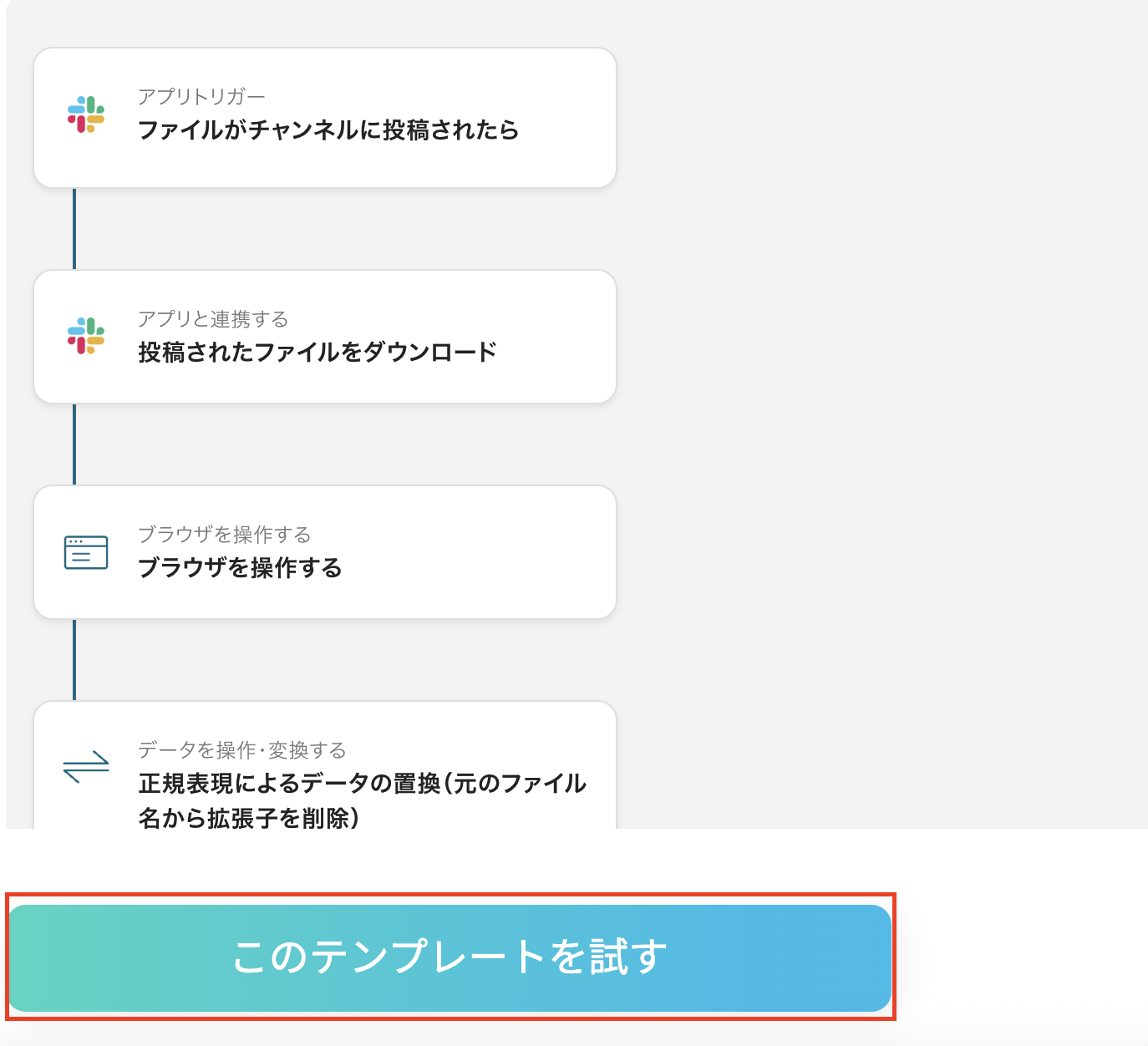先ほどコピーしたテンプレートの「ファイルがチャンネルに投稿されたら」をクリックしてください。