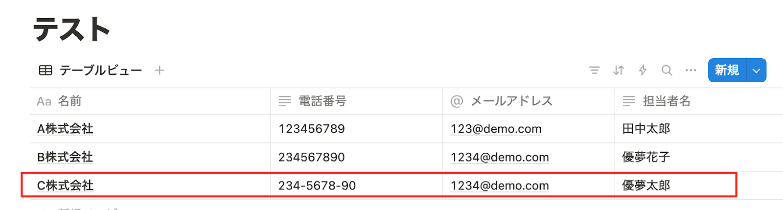 テストに成功したら、Notionの画面に移り、レコードが追加されているか確認をしてください。