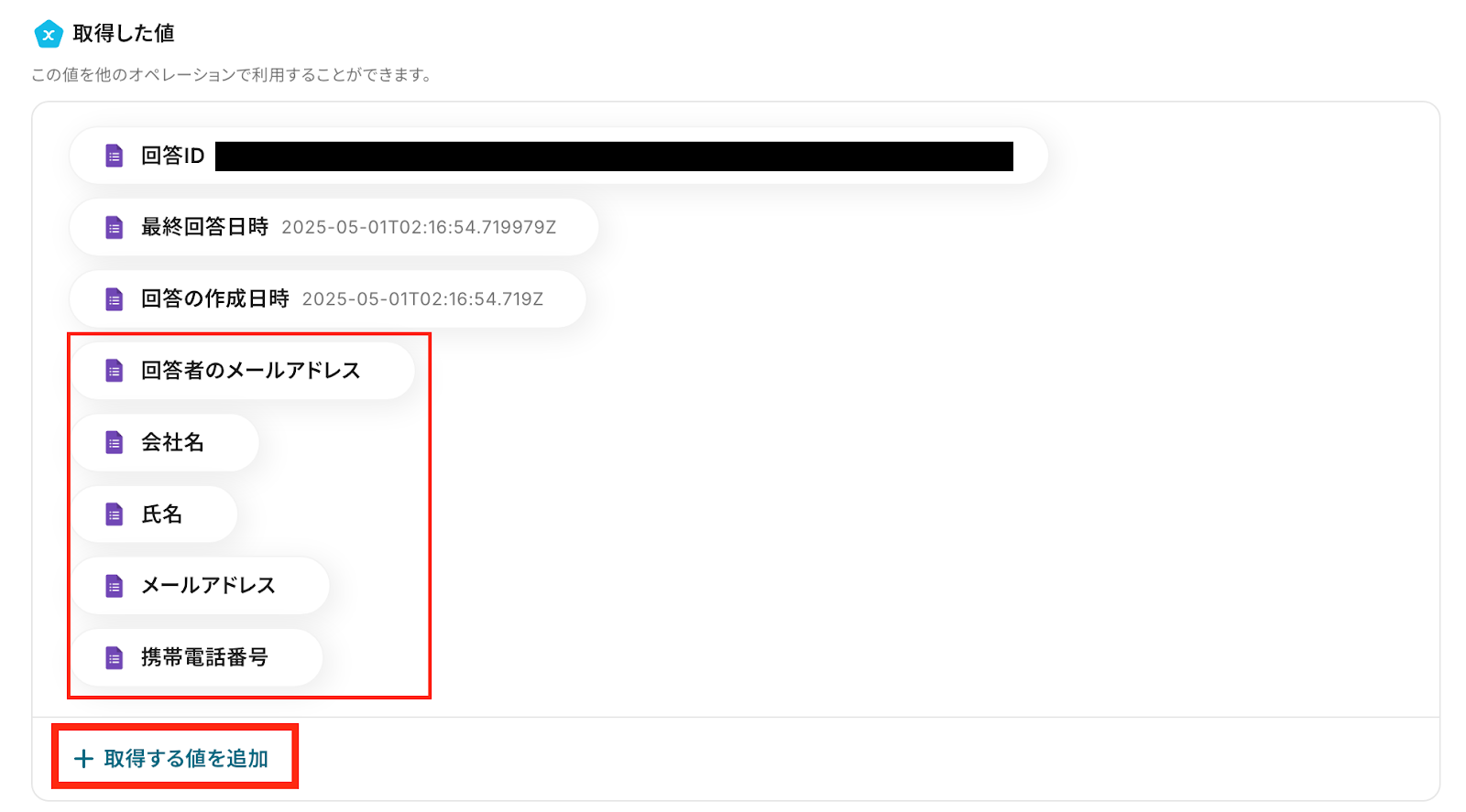 しかし、以下のように「会社名」などが空欄の場合、「+取得する値を追加」から追加する必要があります。「+取得する値を追加」をクリックしましょう!