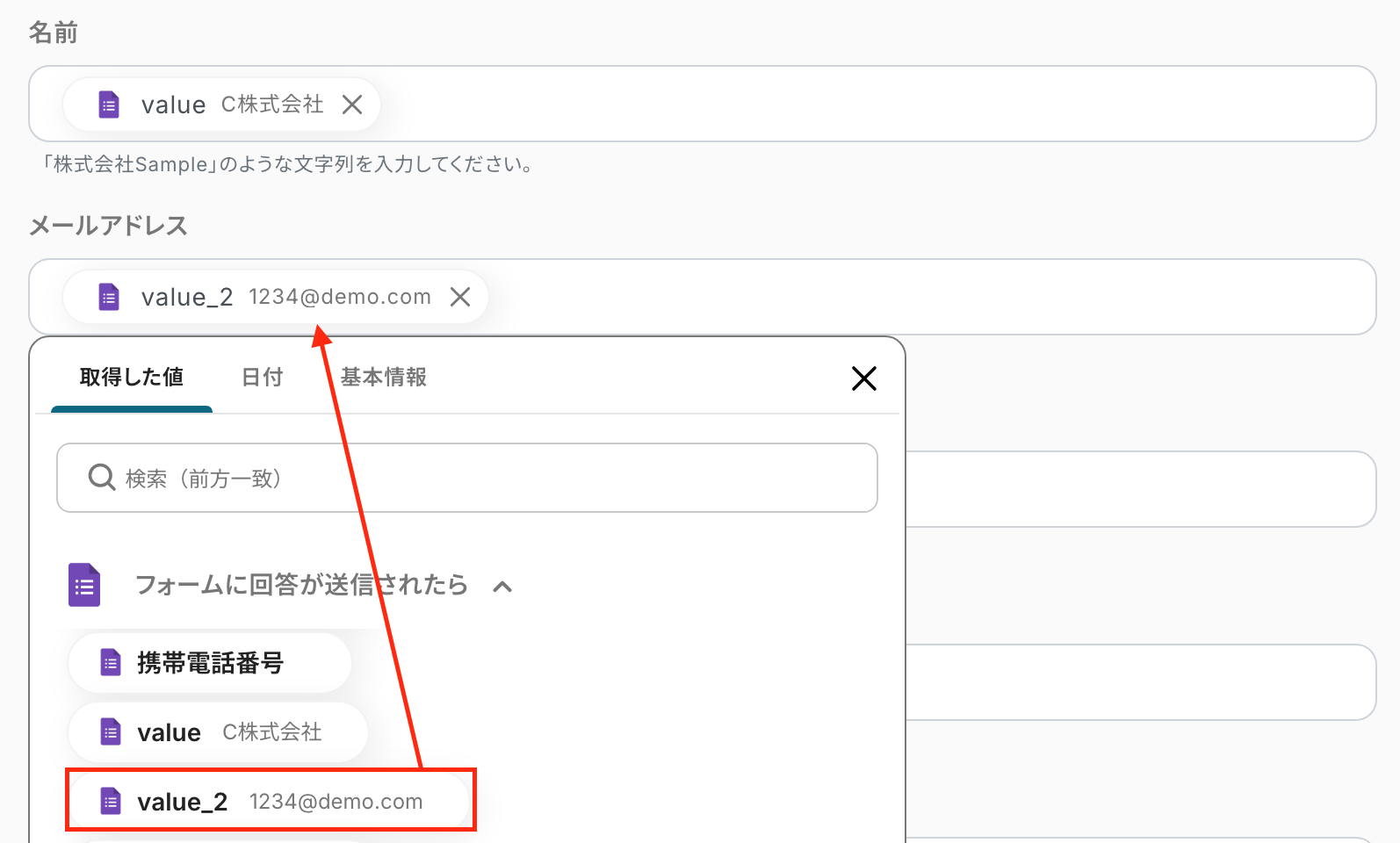 他の項目は、「フォームに回答が送信されたら」を選択して表示される「取得した値」から該当する値を入力しましょう。