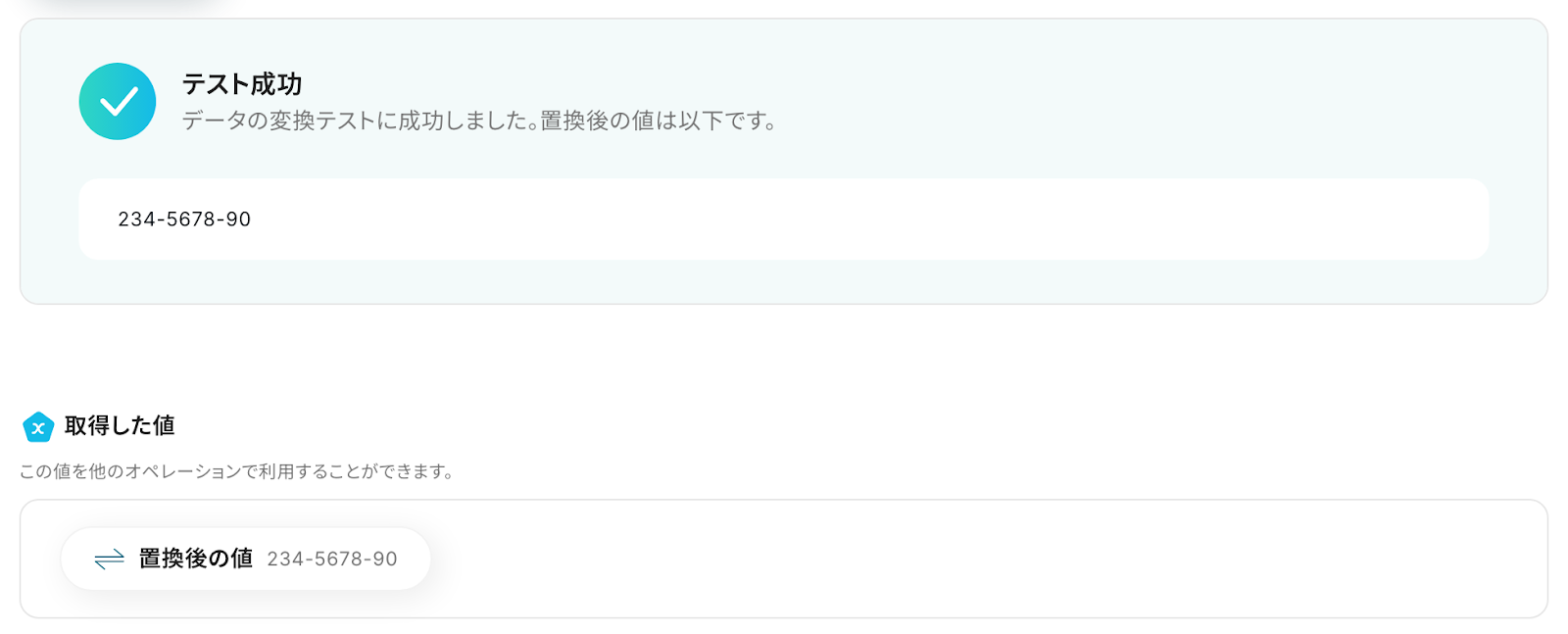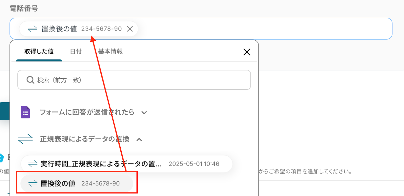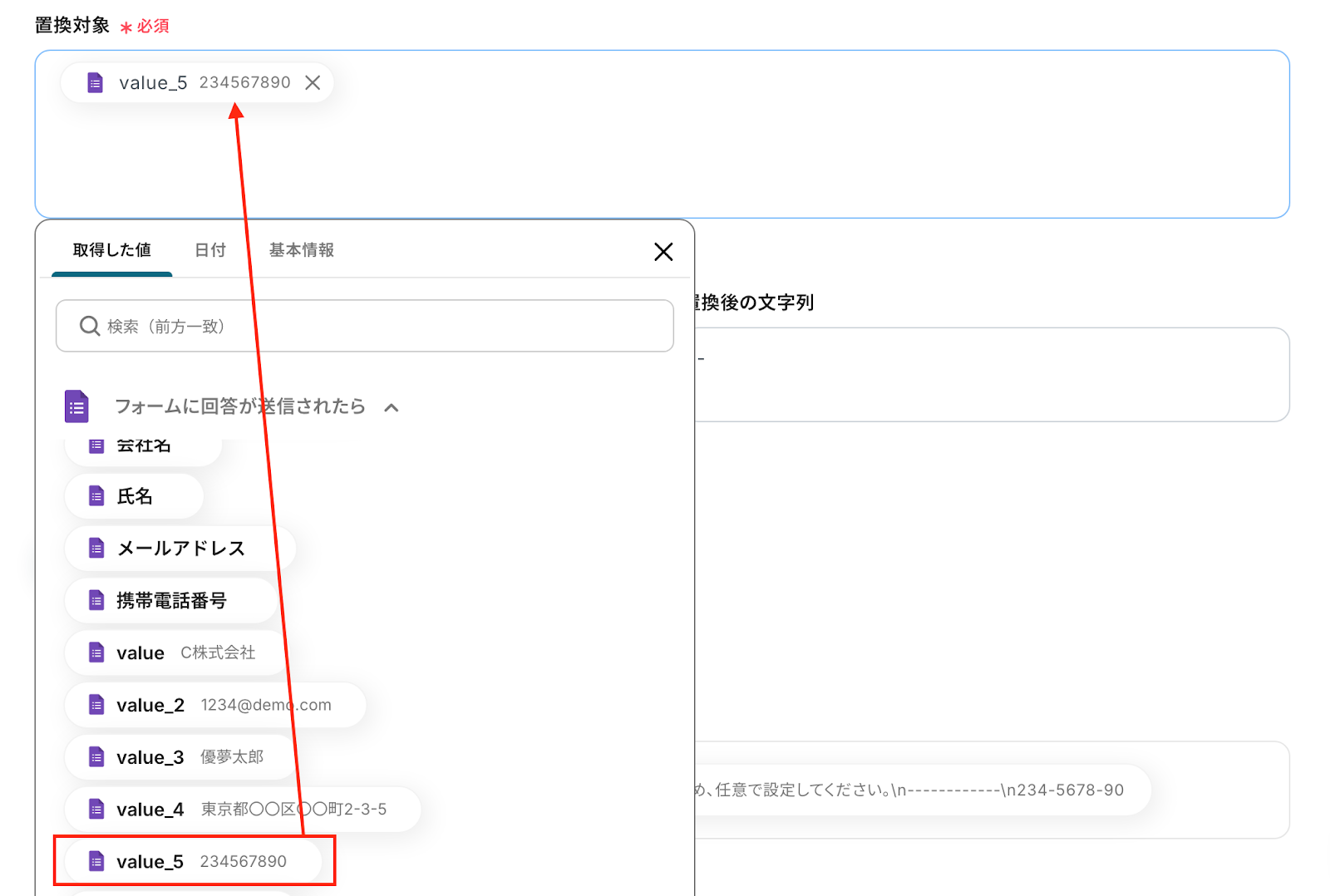 (以下は例として、「電話番号」の項目に、先ほど設定をした「置換後の値」を引用したものです。)