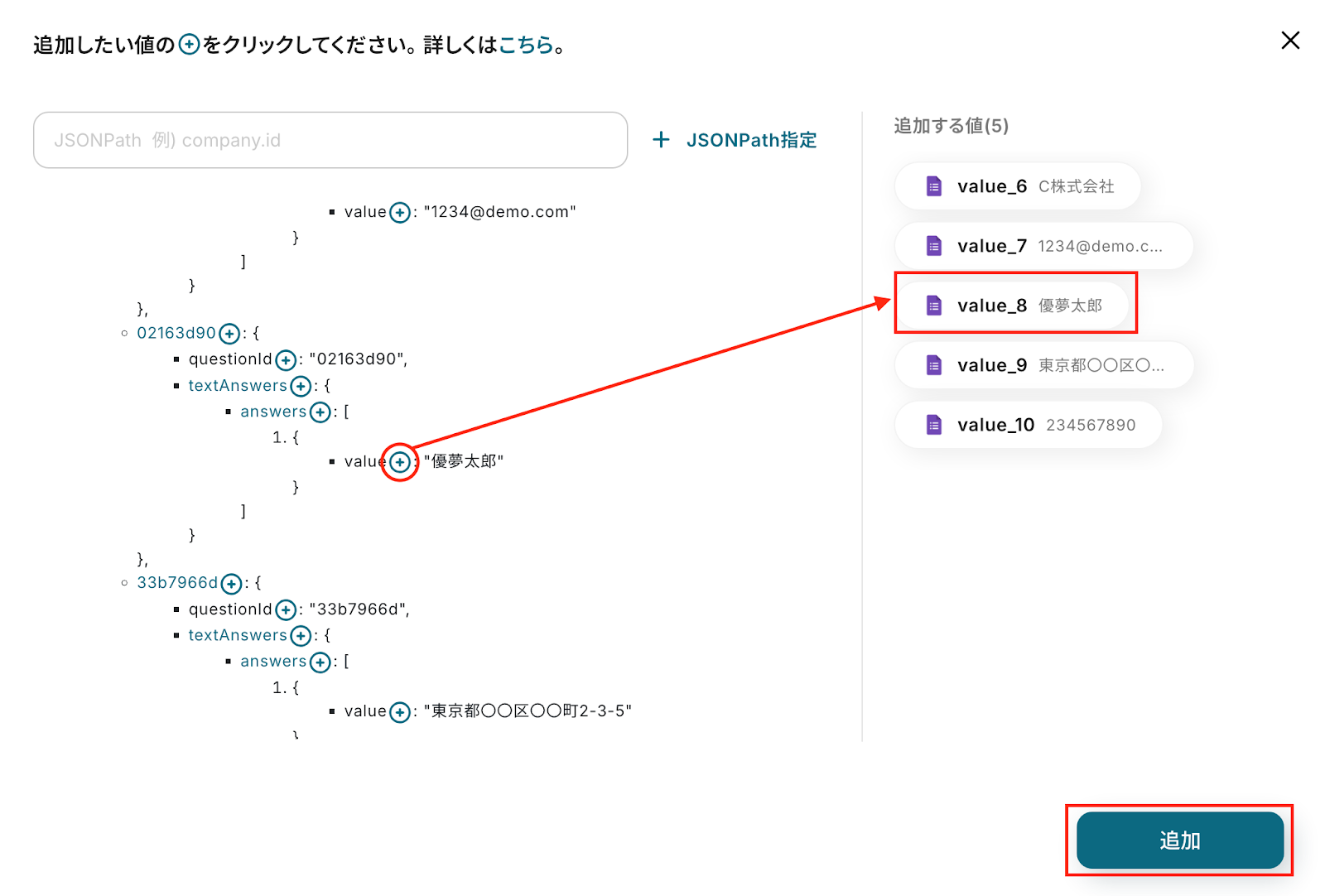 すると、画面右の「追加する値」に選択した項目が表示されます。確認ができたら、「追加」をクリックしましょう。