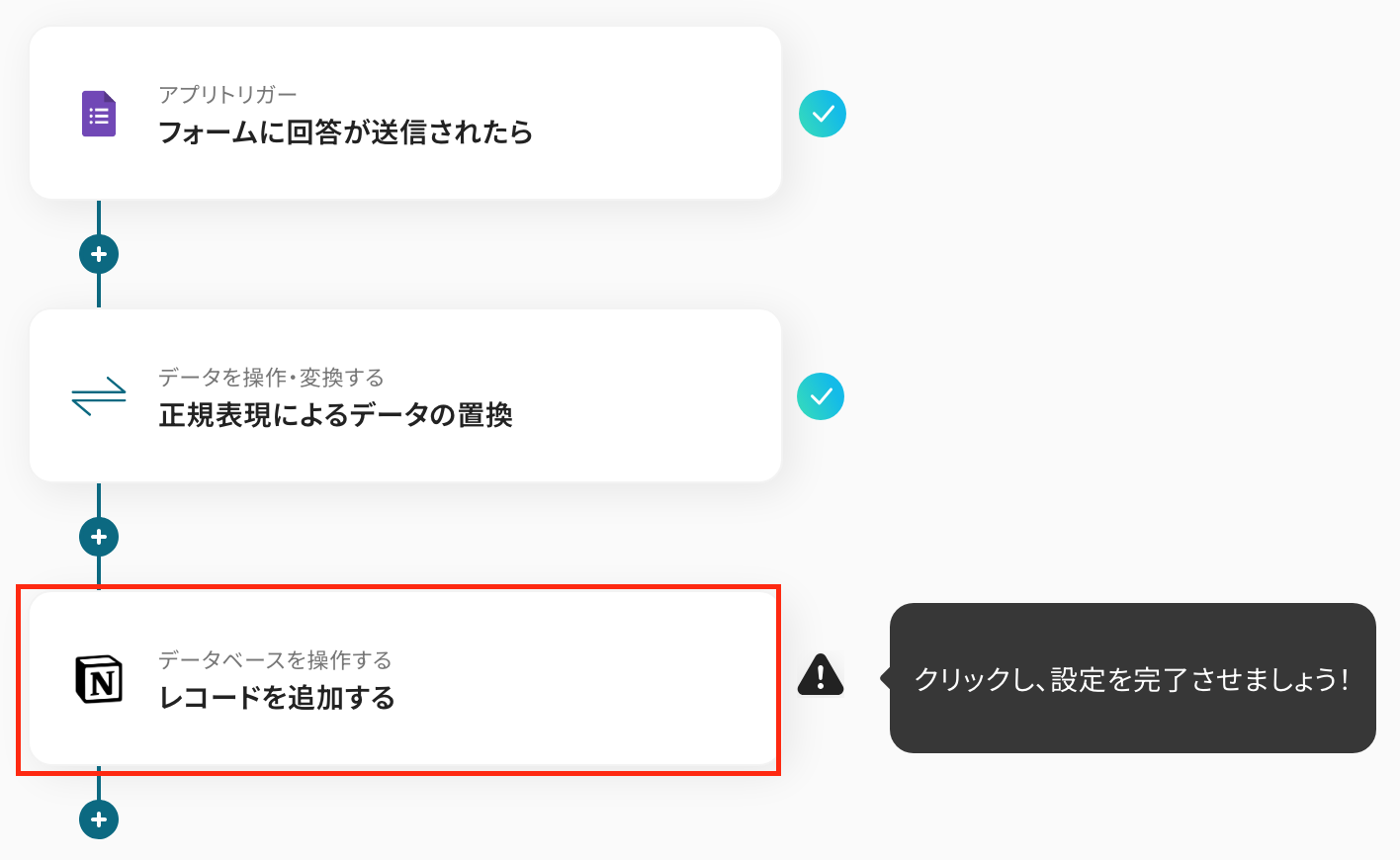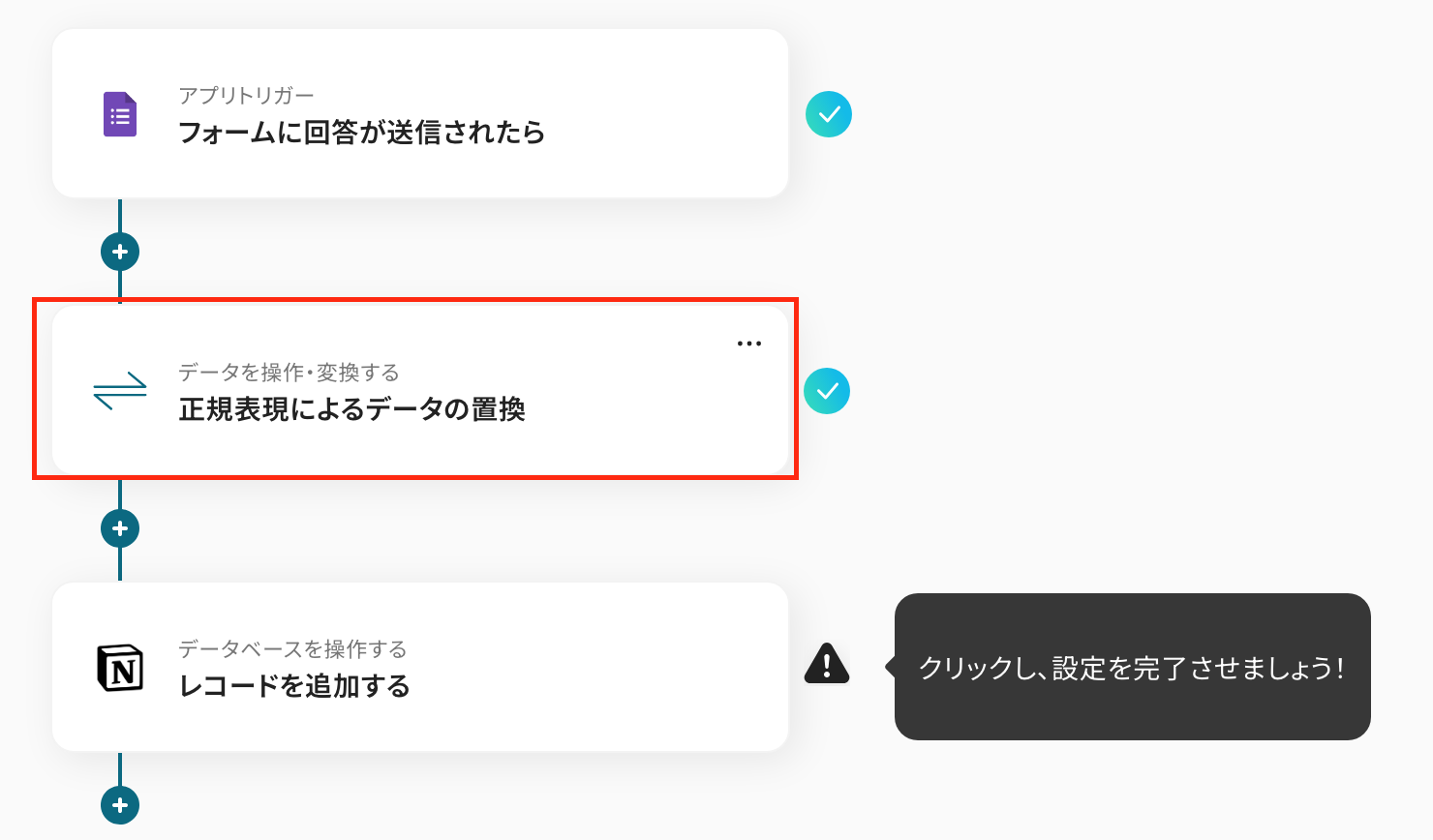 それではここから代表的な例として、Googleフォームで回答が送信された際に、回答内容に含まれる特定のテキストを正規表現で自動的に変換・置換し、その結果をNotionデータベースへ追加するフローを解説していきます!