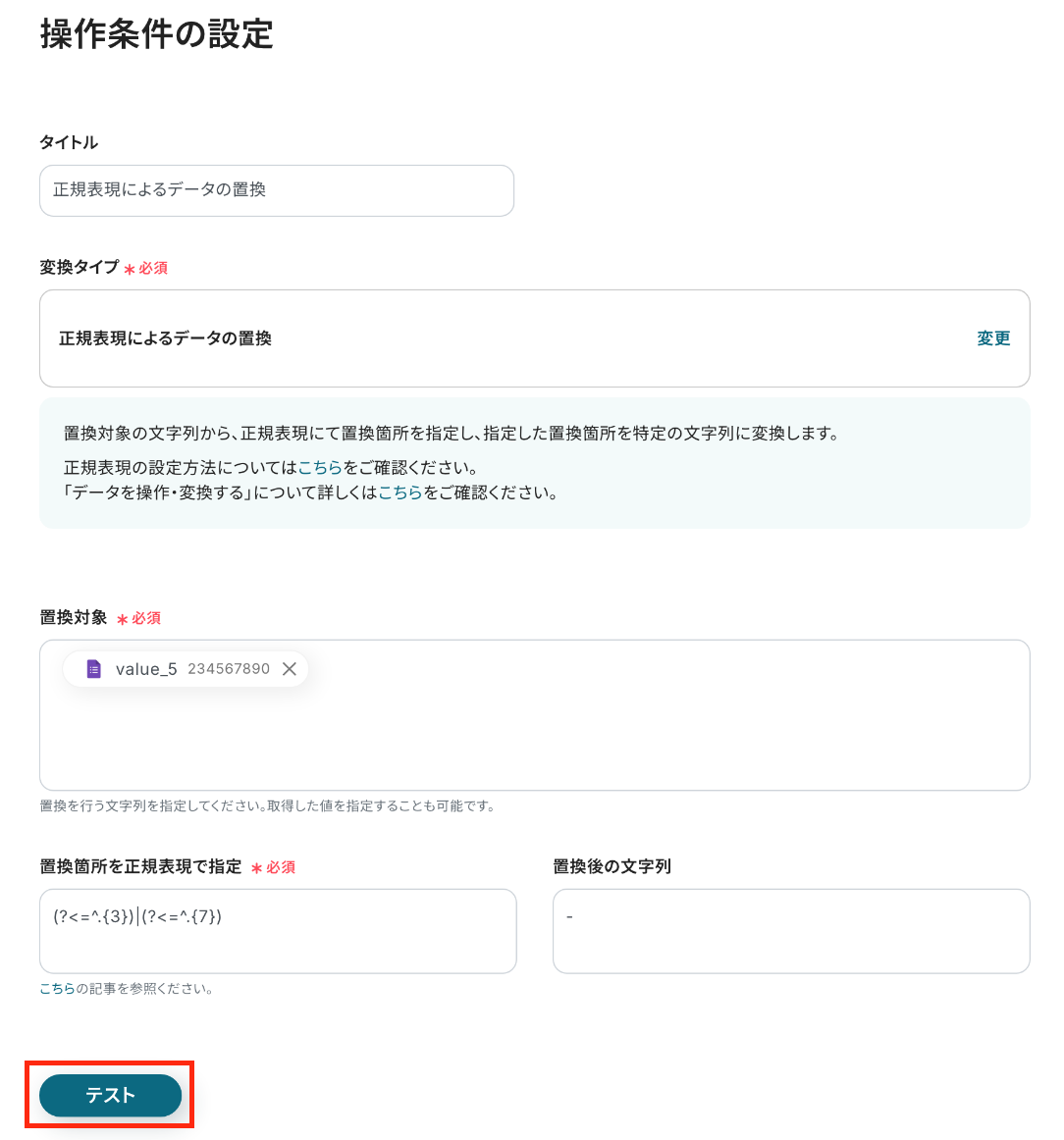 「置換箇所を正規表現で指定」は、任意で設定できます。正規表現に関する内容はこちらのページをご覧ください。
