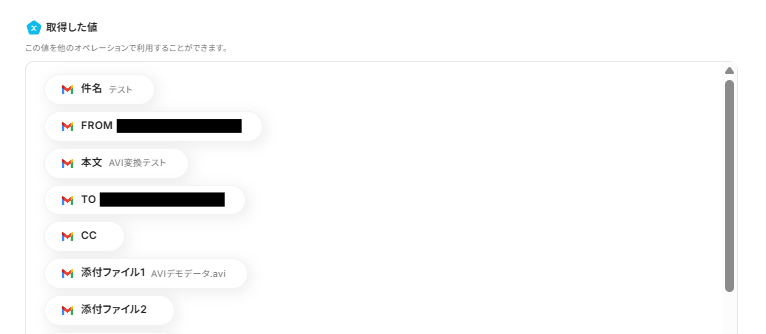 実際にAVIファイルを付けたテストメールを送信し、Yoomで「テスト」をクリックしましょう。