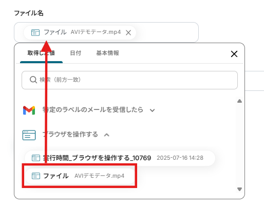 ⑧ファイルの添付方法で、「取得した値を使用」を選択し、候補から⑤で取得したファイルを設定します。
