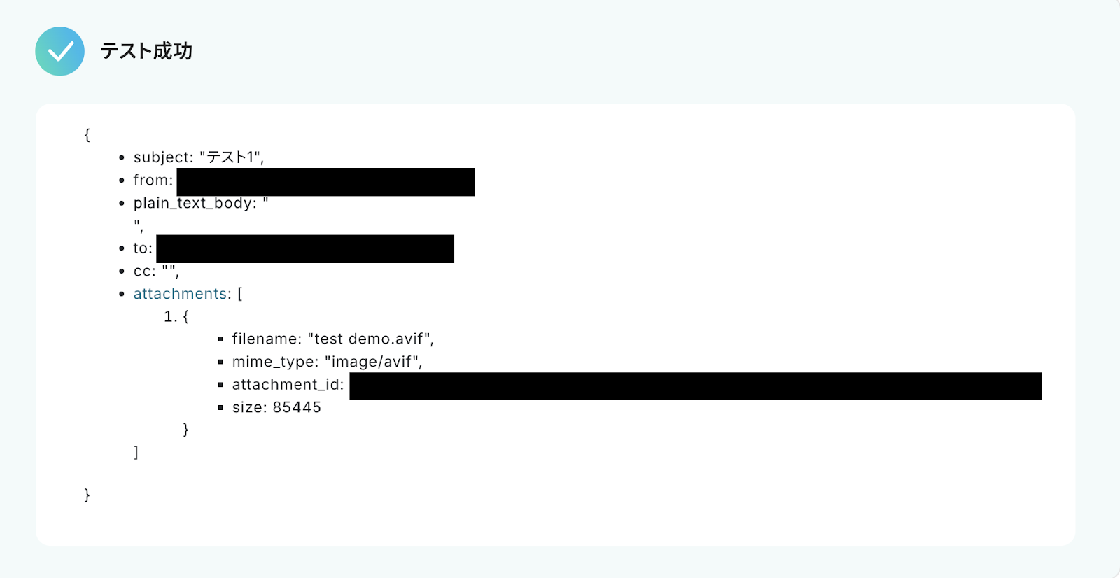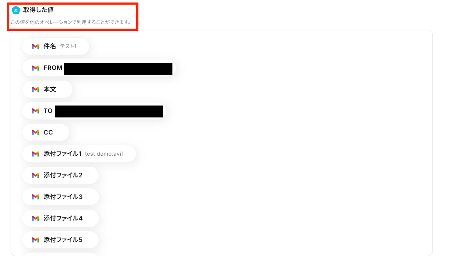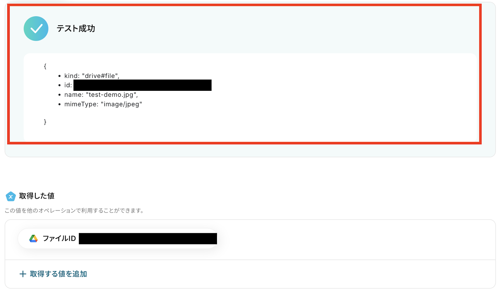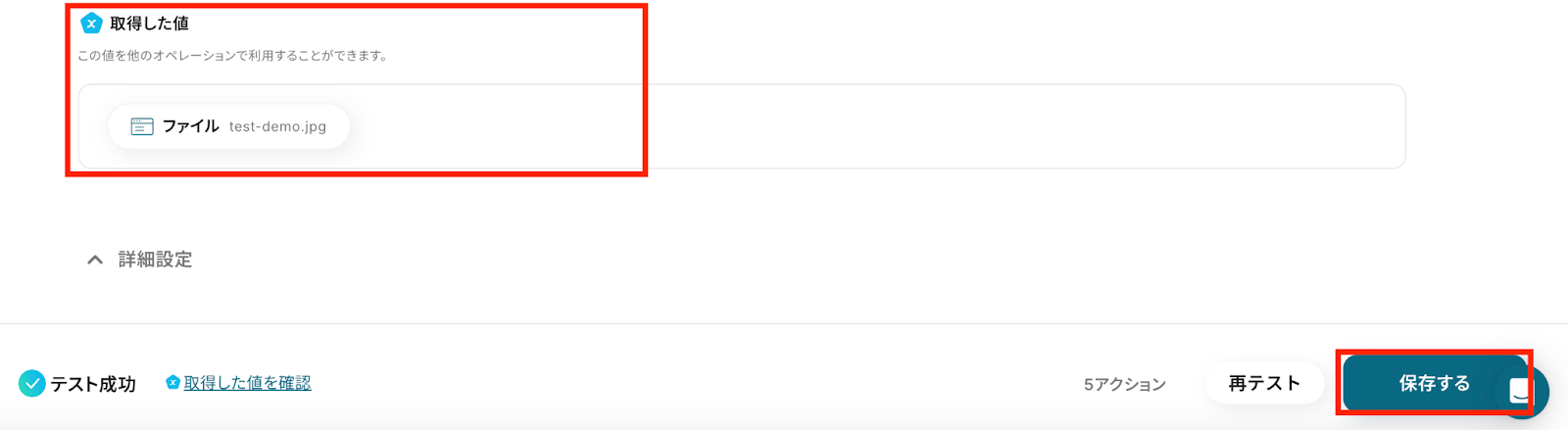 7,「テスト成功」と表示が出たら、アウトプット (取得した値)が取得されます。 ※アウトプットとは、トリガーやオペレーションにて取得した値を指します。 取得したアウトプットは、後続のオペレーション設定時の値としてご利用いただくことができ、フローボットを起動する度に、変動した値となります。