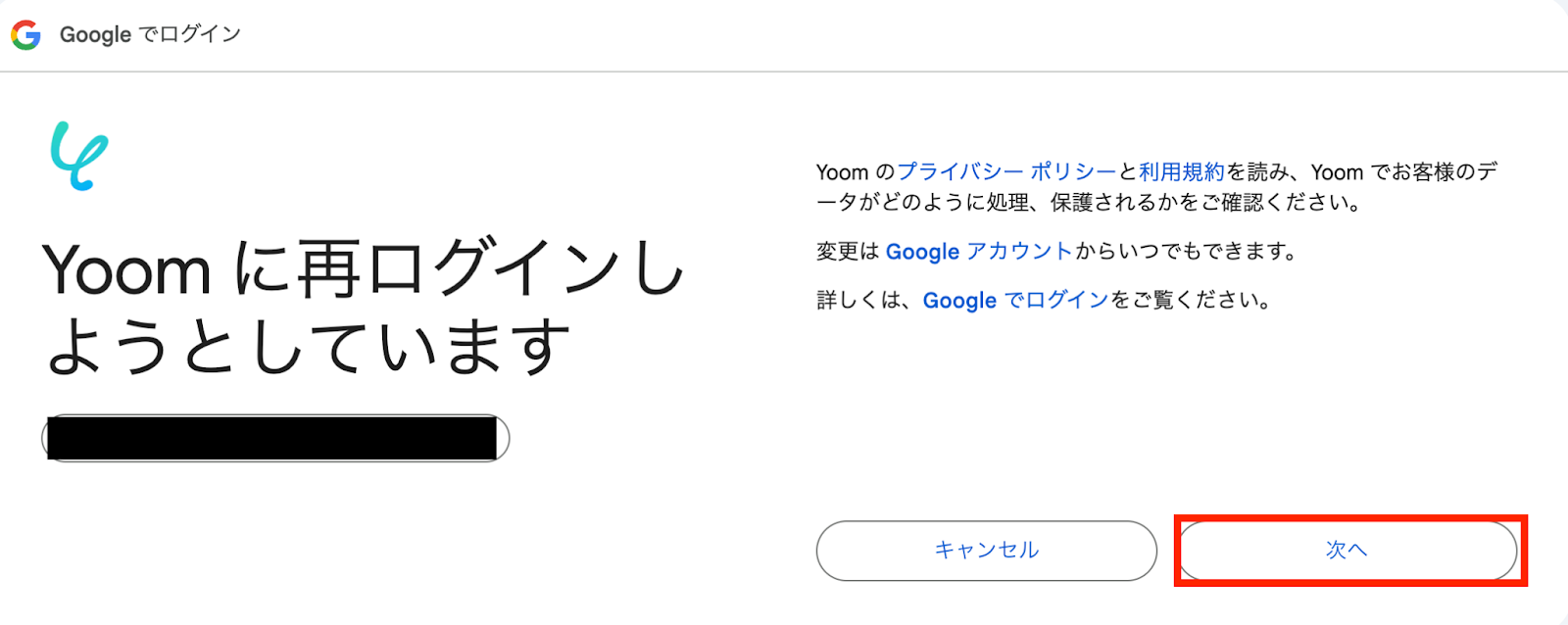 5,再ログインの表示が出た方は「次へ」でそのまま進みます。