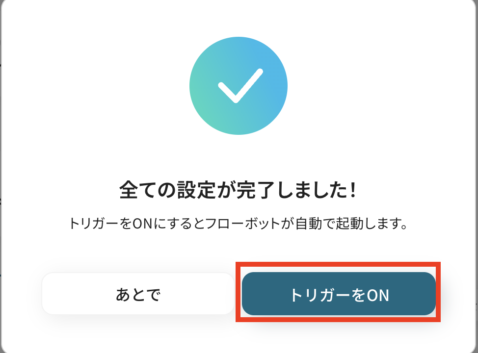 これですべての設定が完了です! 設定が完了すると以下のようなメニューが表示されるので、「トリガーをON」にします。 これですべての設定が完了したので、動作確認をしてみましょう。