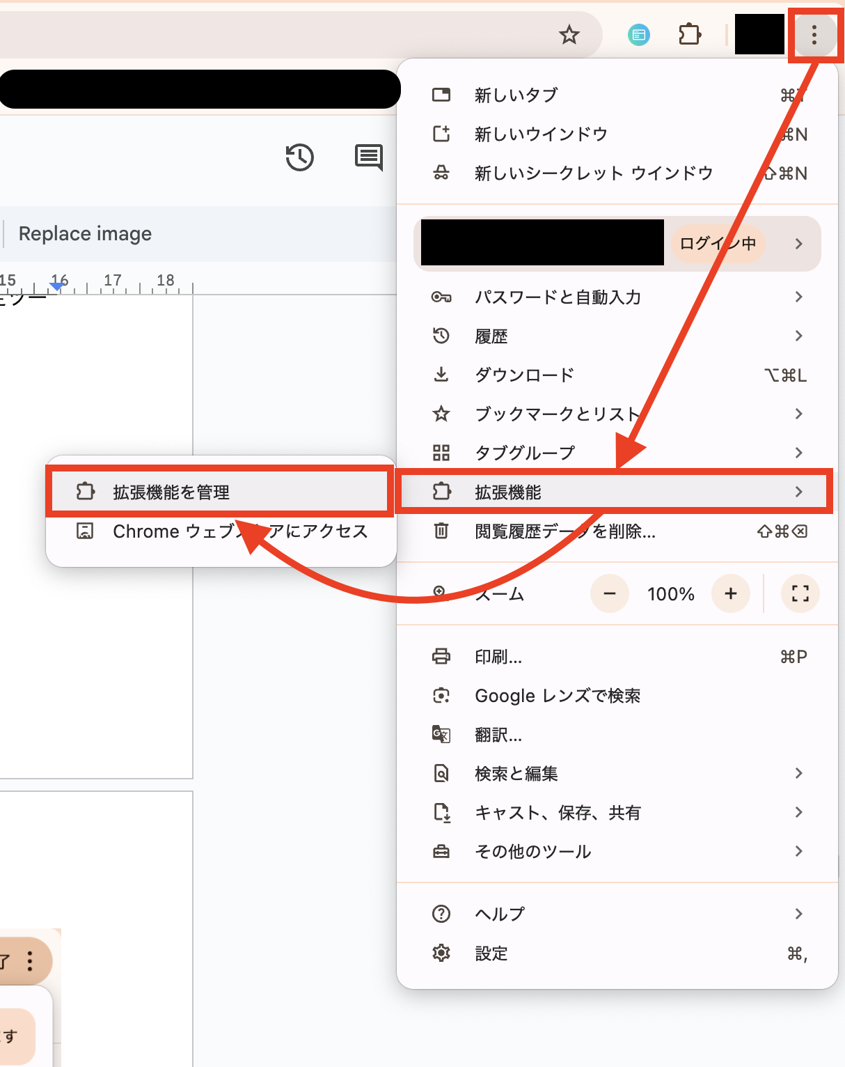 2,この操作を行うには、シークレットモードでの実行を許可する事前準備が必要になります。 Google Chromeで、こちら から説明に沿って「Yoomブラウザ操作オペレーション設定ツール」というChrome拡張機能を追加してください。 その後、右上の設定から「拡張機能」「拡張機能を管理」の順にクリックします。