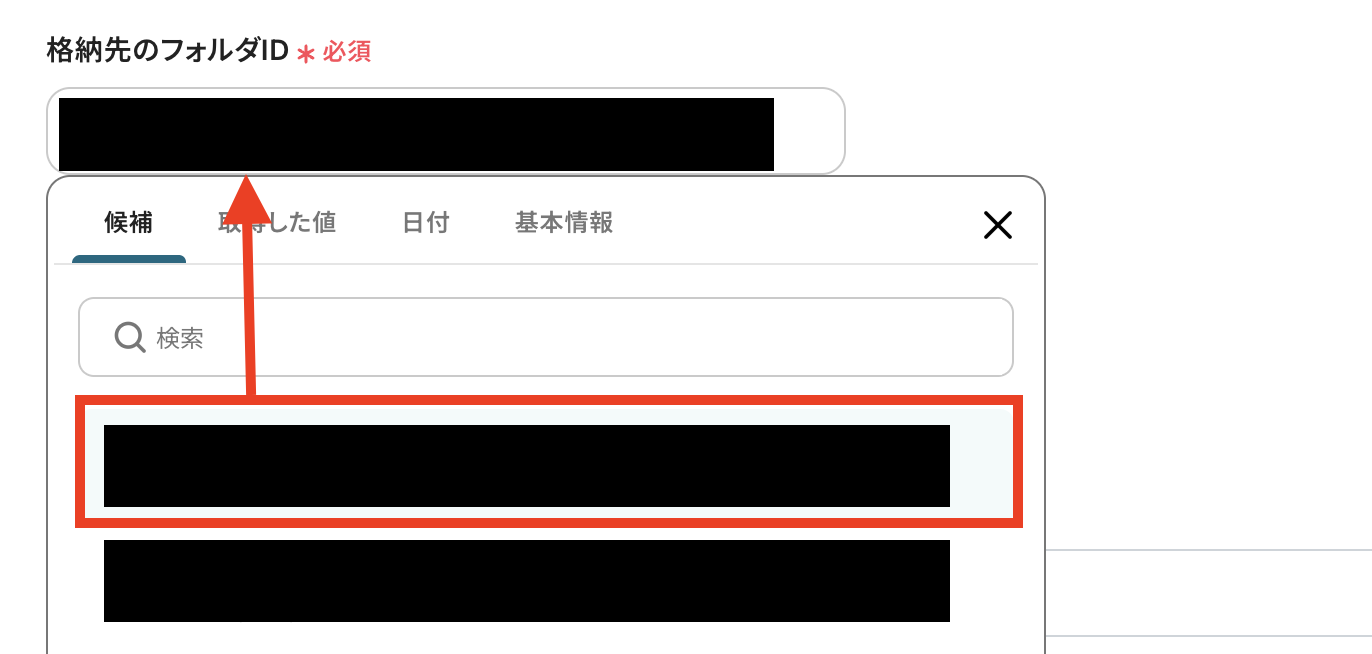 3,Google DriveのフォルダIDを設定します。 空欄をクリックすると候補が表示されますので、ファイルを格納したいフォルダ先を設定してください。 ※希望のファイルが表示されない場合は、検索欄や手動でのフォルダID設定も可能です。