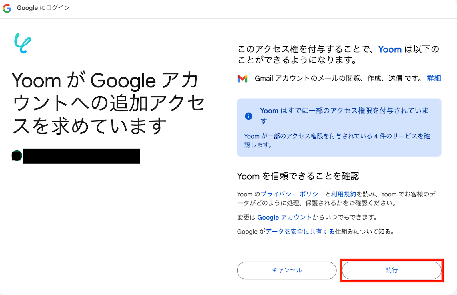 4,アクセスを求める文言が表示されたら、右下の「続行」を押します。