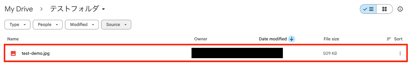5,「テスト成功」と表示されたら、Google Driveにアップロードができたサインです。 実際にGoogle Driveにファイルがアップロードされているか確認してみましょう!