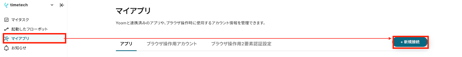 まず最初に、Yoomにログインします。 左メニューにあるマイアプリを押し、右上の新規接続というボタンを押しましょう!