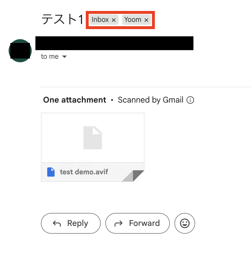 4,GmailにてAVIFのファイルを添付したメールを送信しておきます。 次の設定にてラベルの設定が必要になるので、ラベルをメールにつけておきましょう。 今回は、Yoomのラベルをメールに添付しています。