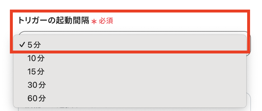 3,トリガーの起動間隔を選択しましょう! トリガーの起動タイミングは、5分、10分、15分、30分、60分のいずれかで設定できます。