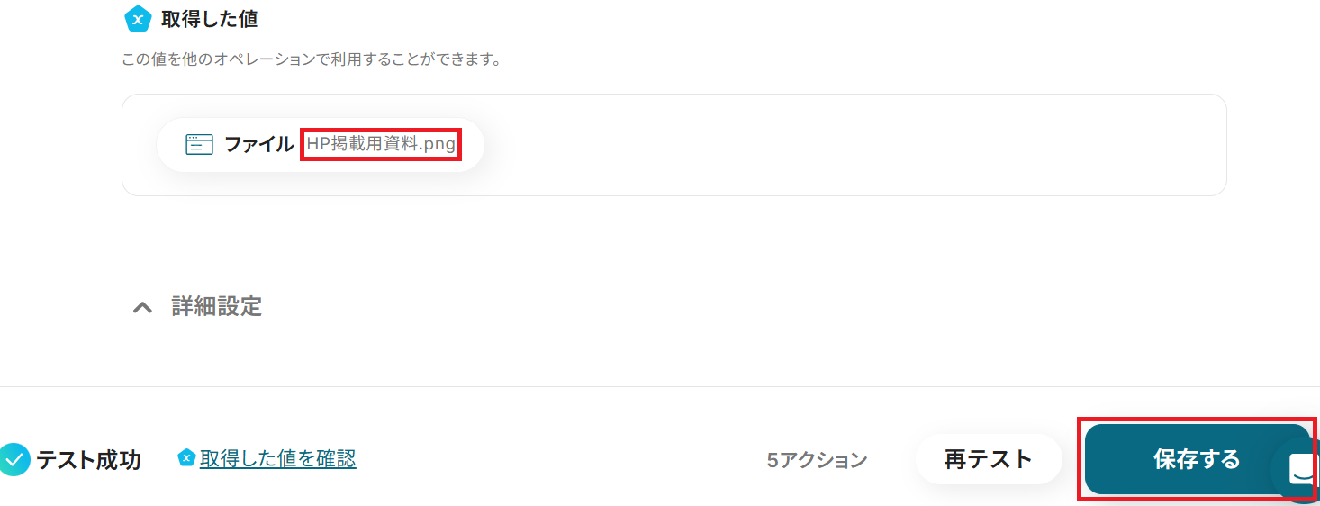 成功したら保存してください。ここで取得したアウトプットの値は次のステップで活用できます。