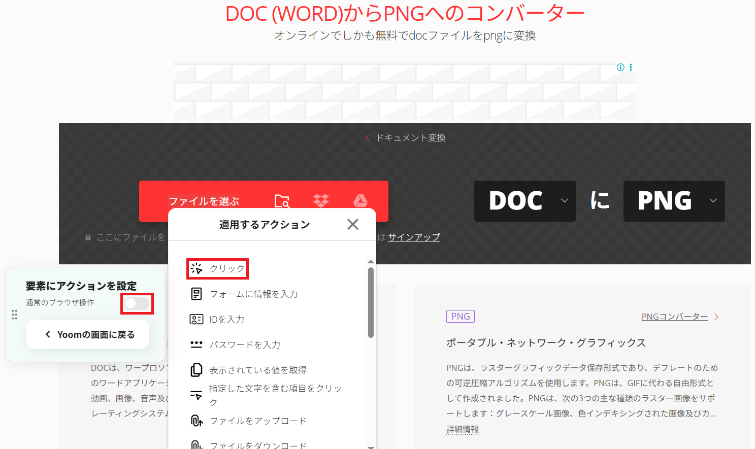 薄水色の「要素にアクションを設定」という表示の「通常のブラウザ操作」をオフにして、サイト上でクリックしたい箇所(今回は「ファイルを選ぶ」のところ)をクリックしてください。