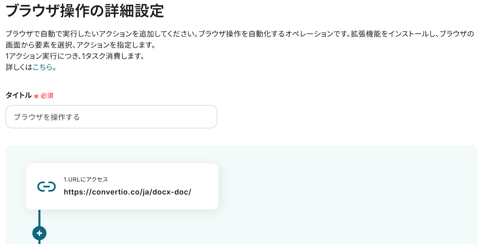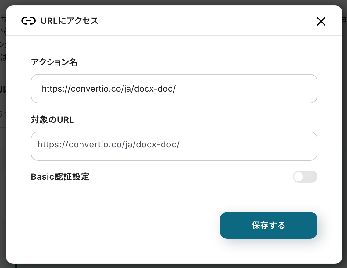 ※今回は操作例として、外部変換サイトを使用しています。用途や社内ルールなどに応じてURLをカスタマイズして使ってください。ご自身で指定したサイト上で、アクションを一つずつ設定していきましょう。なお、設定の方法はヘルプページを参考にしてください!