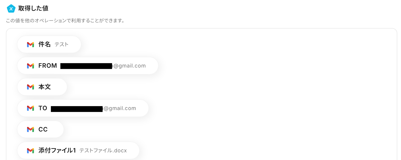 DOCXファイルを添付したメールを送信後、「テスト」をクリックしましょう! テストが成功すると、アウトプットが表示されます。 ここで取得したアウトプットを、後のアクションで利用します。アウトプットについて | Yoomヘルプセンター