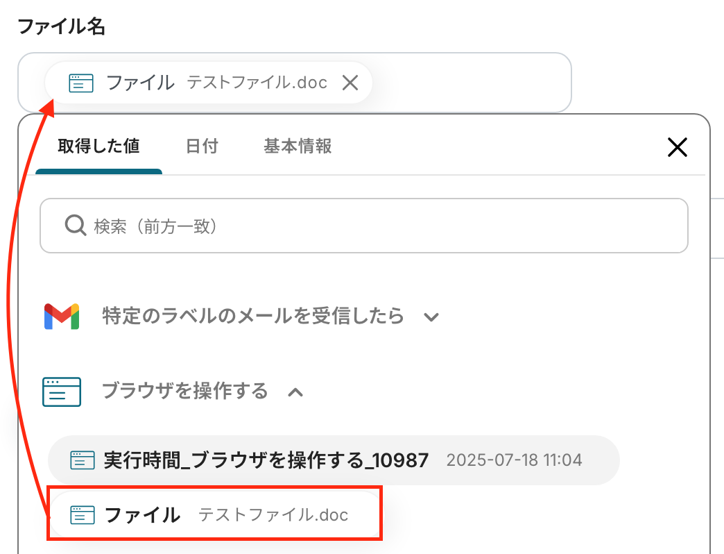 ファイルの添付方法:「取得した値を使用する」を選択