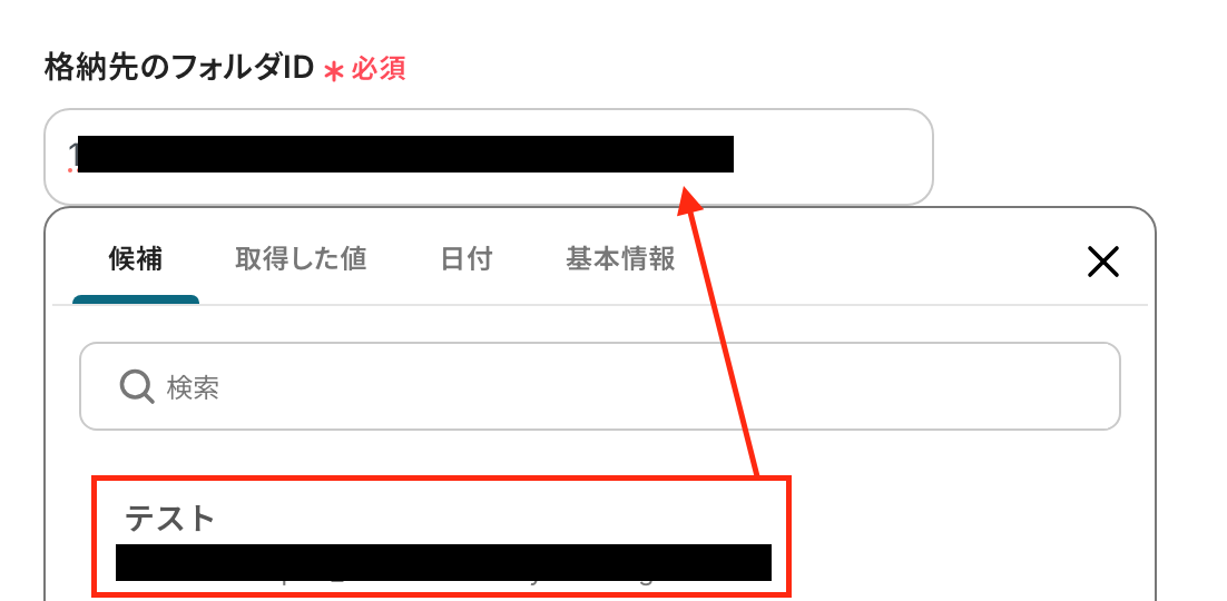 格納先のファイルID:入力欄をクリックして表示される「候補」から引用して設定します。