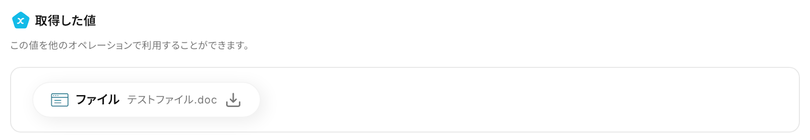 すべての設定が終わったら「テスト」をクリックします。 テストに成功すると、アウトプットが表示されます。 ※アウトプットに表示された「ファイル」にカーソルを合わせると、DOCファイルをダウンロード出来ます。
