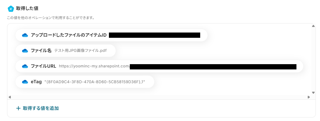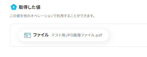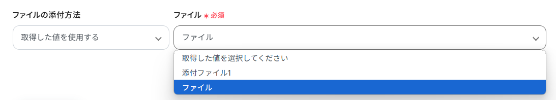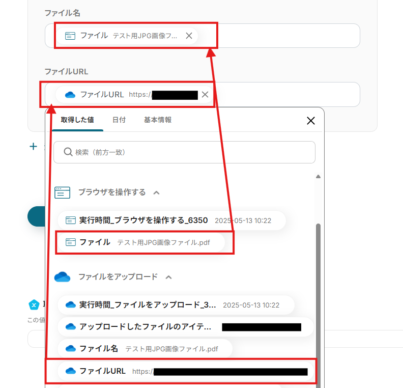 「ファイル名」「ファイルURL」は、入力欄をクリックして表示されるアウトプット(取得した値)から選択できます。