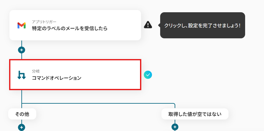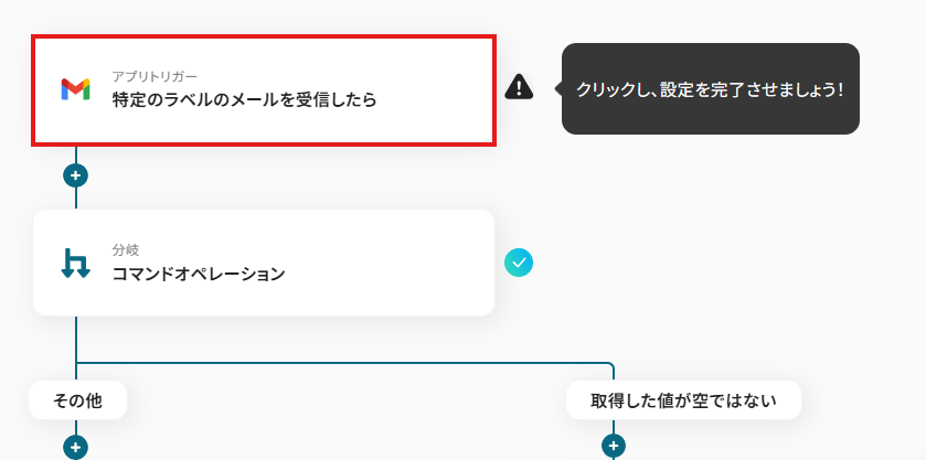 先ほどの画面で「OK」をクリックして、表示された画面のアプリトリガー「特定のラベルのメールを受信したら」をクリックしましょう。