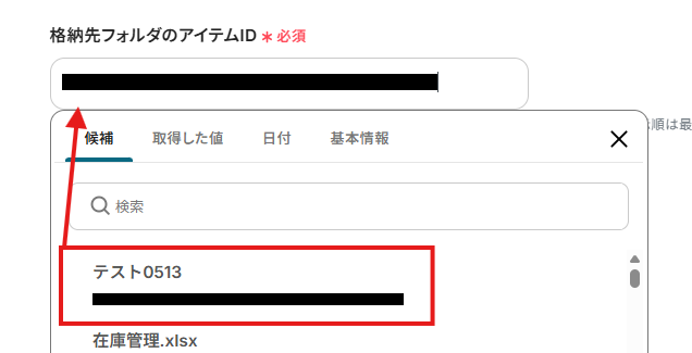 「格納先フォルダのアイテムID」は、入力欄をクリックして表示される候補から選択してください。