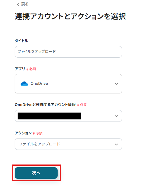 連携するアカウント情報には、ステップ1で連携したアカウント情報が反映されています。トリガーアクションはそのままにして、「次へ」をクリックしてください。