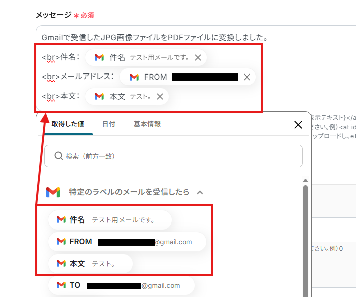 「メッセージ」は、入力欄をクリックして表示されるアウトプット(取得した値)から選択できます。