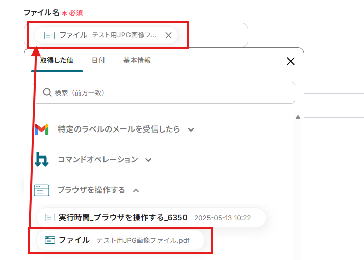 「ファイル名」は、入力欄をクリックして表示されるアウトプット(取得した値)から選択できます。