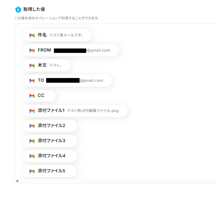 5.入力を終えたら「テスト」をクリックし、「取得した値」にアウトプットとしてデータが抽出されていることを確認してください。