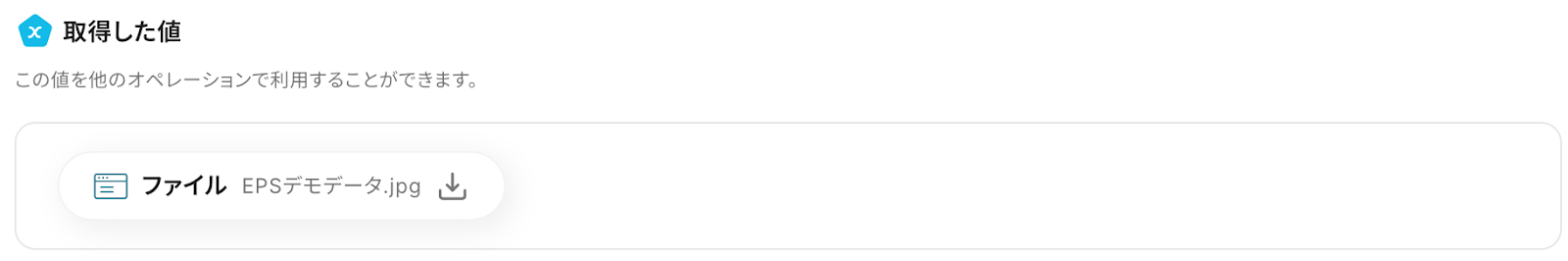 テストに成功すると、アウトプットが表示されます。アウトプット はこの後の設定で活用するので、間違いがないか確認してください。 ※アウトプットに表示された「ファイル」にカーソルを合わせると、JPGファイルのダウンロードが可能です。