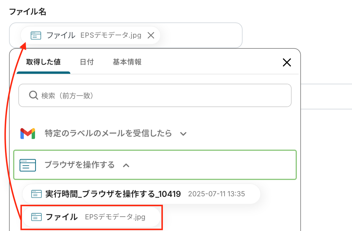 ファイルの添付方法: 「取得した値を使用する」を選択